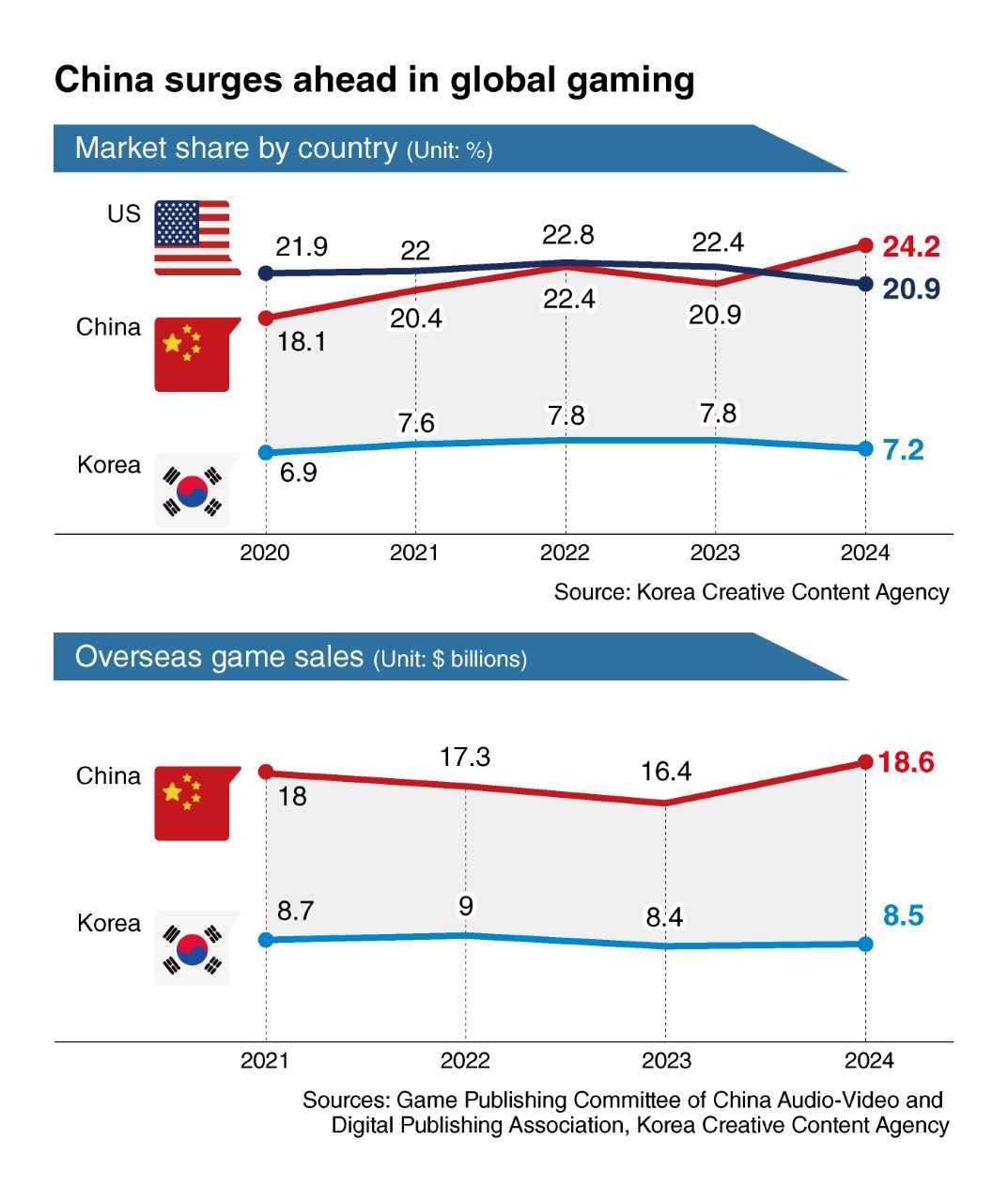 According to the Korea Creative Content Agency’s (KCCA) 2025 Game Industry White Paper, China secured the top position in the global game sector in 2024 with a dominant 24.2 percent market share, surpassing the United States for the first time. The US market share declined to 20.9 percent, a 1.5 percentage point decrease from the previous year, while China’s presence grew by 3.3 percentage points during the same period.